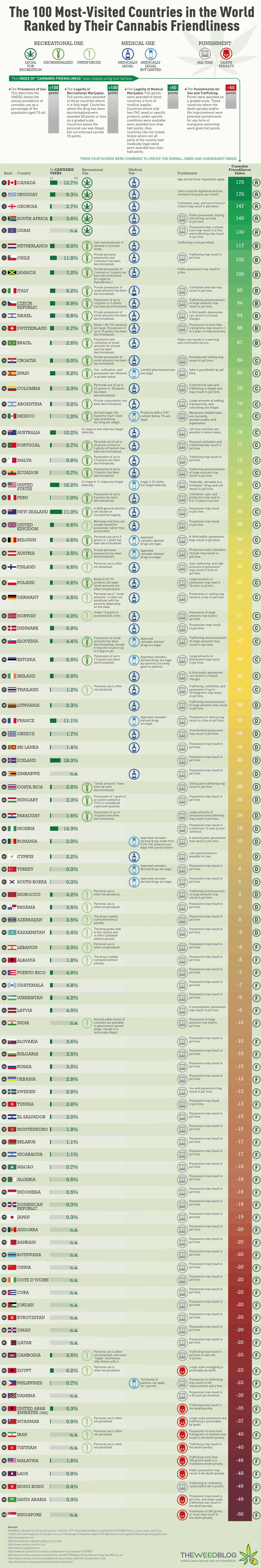 <a href="https://theweedblog.com/policies/100-most-cannabis-friendly-countries"><img src="https://theweedblog.com/wp-content/uploads/100-countries-ranked-by-cannabis-friendliness.jpg" alt="The 100 Most-Visited Countries in the World Ranked by Their Cannabis Friendliness - TheWeedBlog.com - Infographic" title="The 100 Most-Visited Countries in the World Ranked by Their Cannabis Friendliness - TheWeedBlog.com - Infographic"></a><br><a href="https://theweedblog.com" alt="TheWeedBlog.com" title="TheWeedBlog.com">By TheWeedBlog.com</a> Methodology: